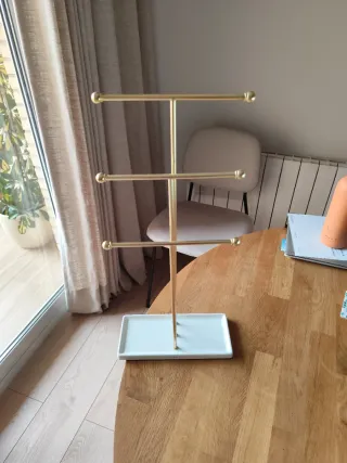 Elegante organizador de joyas con acabado dorado y base blanca. - Tres niveles, de 50, 36 y 26 cm de altura para colgar collares y pulseras. - Bandeja inferior para guardar pendientes o anillos. - Diseño moderno y funcional.