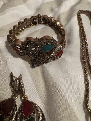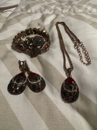 Elegante conjunto de joyas con un diseño intrincado, perfecto para ocasiones especiales. - Pulsera con detalles en piedras rojas y verdes. - Pendientes a juego con diseño de lágrima. - Collar con colgante a juego. Sólo se ha usado en una ocasión.