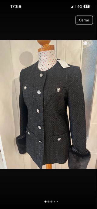 Chaqueta elegante de Mango, nueva y con etiquetas. con bolsillos mide de axila a axila 47 largo 64 hombros 40 manga 65 - Diseño tweed con hilo brillante. - Botones joya decorativos. - Puños con detalle de pelo sintético que se pueden quitar y dejar sin pelo - Bolsillos frontales. - Forro interior satinado.