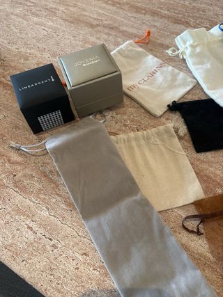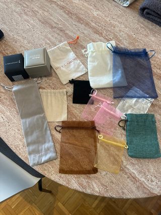Lote de 12 bolsas de tela y 2 cajas para anillos. Las bolsas son de distintos tamaños y las cajas son de tamaño estándar. Dos de las bolsas tienen una el nombre de una marca escrita, se ve en las fotos.