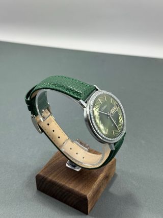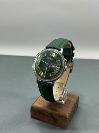 Reloj mecánico Slava de fabricación soviética. - Esfera de color verde con detalles. - Correa de piel verde. - Caja plateada. El estado es excelente, todo funciona Se ve muy bien VENDO EN VALENCIA