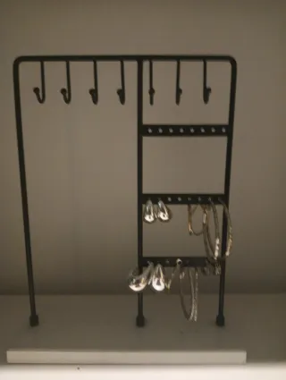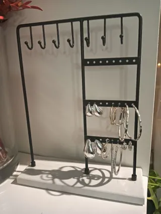 Elegante organizador de joyas con un diseño moderno. - Estructura metálica negra. - Base de color plateado. - Múltiples ganchos y orificios para colgar pendientes y collares.