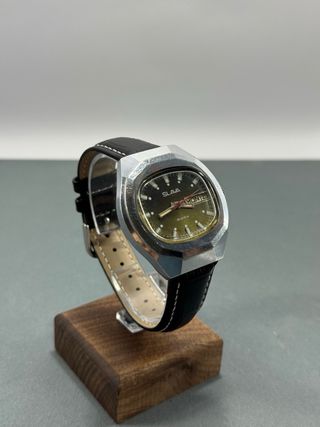 Reloj automático de la marca Slava con 26 joyas. - Esfera en tonos verdes y dorados. - Correa de cuero negra con pespuntes blancos. - Ventana de día y fecha. Todo funciona Vendo en VALENCIA