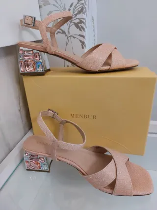 Elegantes sandalias de fiesta con detalles de pedrería. - Diseño de tiras finas con pedrería. - Cierre de pulsera al tobillo. - Tacón fino.