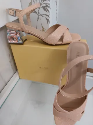 Elegantes sandalias destalonadas con un toque de brillo. - Tacón bloque adornado con piedras. - Diseño cruzado en la pala. - Cierre de hebilla al tobillo.
