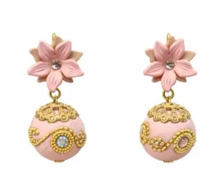 Pendientes rosa claro con un diseño delicado y elegante. - Mide 5cms - Detalle de flor en la parte superior. - Ideales para cual evento, feria, romería. - Bola colgante con adornos dorados. - Cristales incrustados para un toque de brillo.