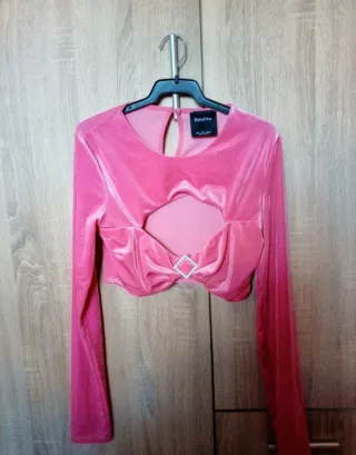 Top de Bershka con un diseño llamativo y moderno. - Tejido brillante tipo lycra. - Escote pronunciado en la parte delantera. - Adorno de joya cuadrada en el centro. - Mangas largas.