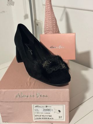 Elegantes manoletinas con tacón y detalle de pedrería y pelo. - Material: Ante. - Adorno frontal con pedrería y pelo. Son de piel, muy buena calidad