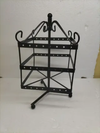 Elegante organizador de joyas con un diseño giratorio. - Fabricado en metal. - Múltiples niveles para colgar pendientes y otros accesorios. - Base estable con patas. -giratorio con tres niveles.