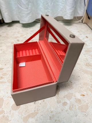 Práctico cofre para guardar maquillaje o joyas. Tiene un diseño elegante y es fácil de transportar. - Acabado exterior en color rojo. - Detalles y herrajes en color plateado. - Asa superior para un agarre cómodo. - Cierre frontal de seguridad. - El fondo manchado con maquillaje.