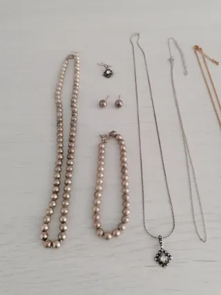 Conjunto de varias piezas de joyería. - Dos colgantes con forma de rosa en plata. - Un pendiente con una perla. - Un par de pendientes pequeños con circonita. - Una pulsera de cuentas. - Dos cadenas, una dorada y otra plateada. - Un pequeño broche con detalles rojos.