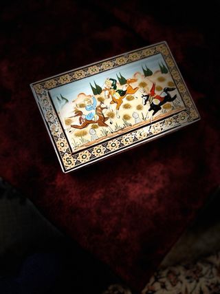Preciosa caja de joya de estilo Khatam, elaborada artesanalmente. Presenta un diseño intrincado y detallado. - Técnica de marquetería Khatam. - Motivos decorativos tradicionales.