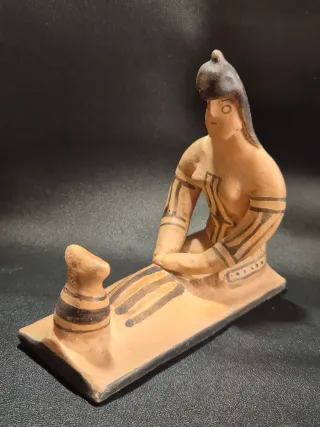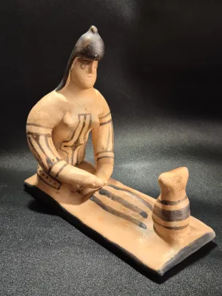 Reproducción moderna de una figura femenina del antiguo Perú, representada mientras realiza algún tipo de trabajo o actividad. Las culturas peruanas antiguas, como los Mochica, Chimú o Nazca, frecuentemente representaban escenas de la vida cotidiana en su cerámica. El tocado cónico y las bandas decorativas en el cuerpo podrían representar vestimenta, joyas, pintura corporal o tatuajes que identificaban su estatus o grupo social. Es una pieza decorativa interesante que refleja la importancia del trabajo femenino en las sociedades andinas antiguas. Ancho: 7 cm Largo: 17 cm Alto: 16 cm Peso: 590 gr