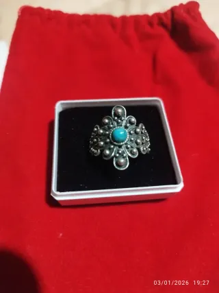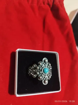 Precioso anillo antiguo con un diseño intrincado y una piedra central. - Detalles en plata. - Piedra central de color turquesa.