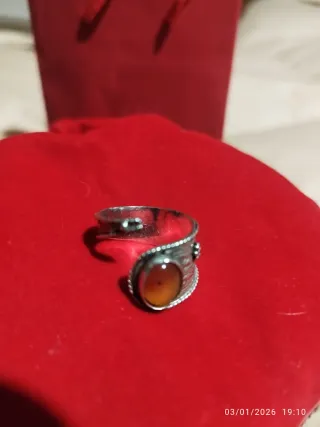 Anillo artesanal con un diseño único - Piedra central cornalina - Detalles plateados en la montura. - Tamaño ajustable