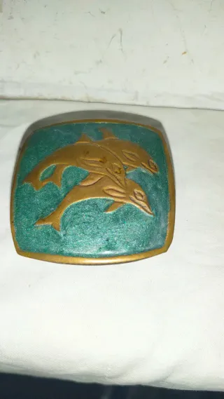 Antigua caja, cajita, joyero de bronce latón esmaltado cloisonné de vivos colores con bonitos adornos de delfines. Auténtica pieza de artesanía. Artículo de coleccionismo. Pieza de arte exclusiva, única. Con una preciosa pátina por el paso de los años. En buenas condiciones, tal y como muestran las fotos. Para guardar pequeñas joyas, utilizar como un adorno decorativo, colocar sobre mesita.