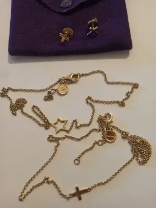 IMPORTANTE: Preguntar disponibilidad antes de comprar. Conjunto de joyería de la marca Aristocrazy de plata 925 con baño de oro amarillo. - Collar con colgante de estrella y cruz. - Pendientes a juego con diseño de cruz. - Incluye bolsa de tela morada.