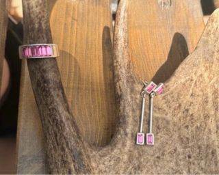 Conjunto de anillo y pendientes de plata de ley. - Diseño con piedras de color rosa. - Plata de ley de alta calidad.