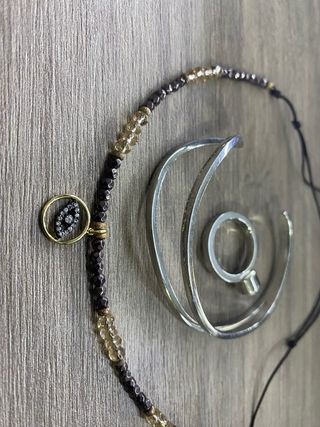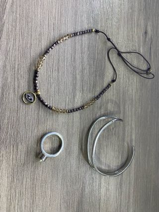 Conjunto de bisutería que incluye un colgante con forma de ojo, un anillo Swatch y una pulsera Calvin llenito - Colgante con detalle de ojo. - Anillo con piedra. - Pulsera de cuentas.