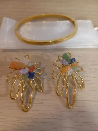 Elegante conjunto de pulsera y pendientes. - Pulsera rígida dorada. - Pendientes con diseño de hoja y piedras semipreciosas. - Combinación de colores vibrantes en las piedras.