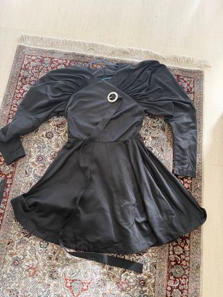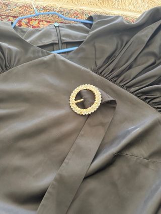 Elegante vestido negro con un diseño llamativo. - Mangas abullonadas. - Detalle de broche joya en la cintura. - Cinturón a juego.(faltan unas piedras, por eso su precio)