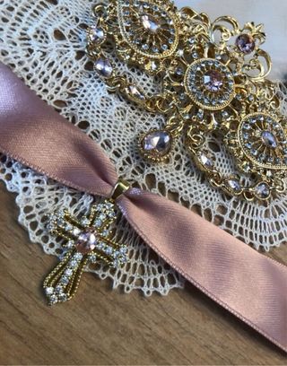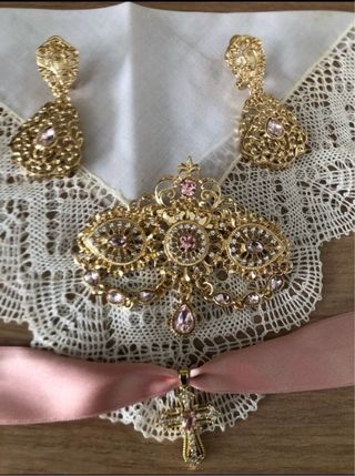 Conjunto de aderezo dorado y piedras rosas. - Diseño elaborado y detallado. - Incluye pendientes a juego. - Colgante central con forma de cruz.