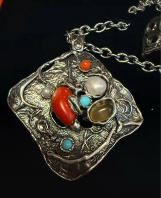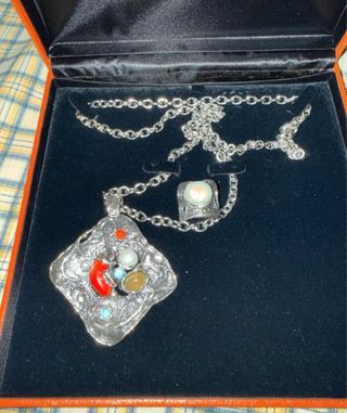Conjunto de collar y anillo a juego con diseño artesanal. - Collar con colgante de plata y piedras semipreciosas. - Anillo a juego con perla. - Diseño único y llamativo. Nuevo a estrenar y en su caja original.