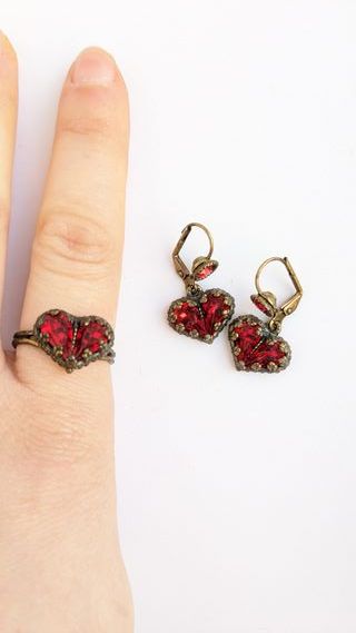Pendientes colgantes de corazones. Anillo de corazón ajustable. Piedras de color rojo intenso brillantes y transparentes. Procedente de Praga. Sin usar.