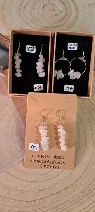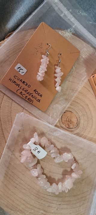Pendientes y colgante en cuarzo rosa/ Artesanal