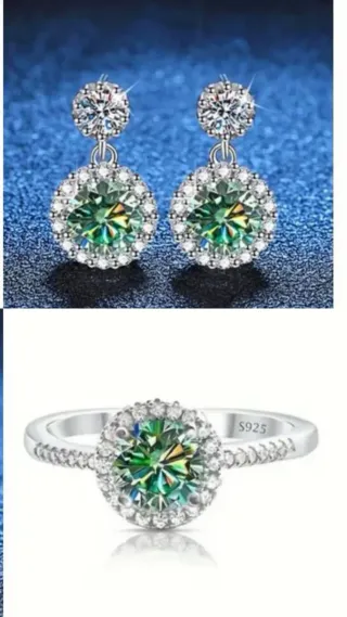Elegante conjunto de joyería compuesto por pendientes y anillo. - Fabricado en PLATA de LEY 925 contrastada en las piezas. - Piedras principales de moissanita de color verde. ANILLO: Moissanita de 1 Quilate con Certificado Gemológico de autenticidad GRA. NÚMERO :9 / 19,8mm. / PENDIENTES con cierre de presión mariposa y REGALO presiones de silicona Con Moissanita de 1 Quilate cada una...Sumando un total de 2 Quilates - Sin estrenar...nuevo - En caja de regalo 🎁 NO negociable