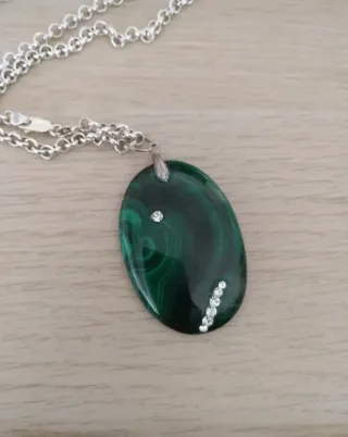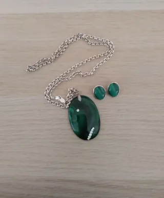 Elegante conjunto de joyería con piedras de malaquita. - Colgante ovalado con detalles. - Pendientes a juego de clip. - Cadena