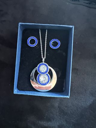 Elegante conjunto de bisutería con detalles en piedras azules. - Pendientes a juego. - Colgante con diseño. - Acabado plateado.