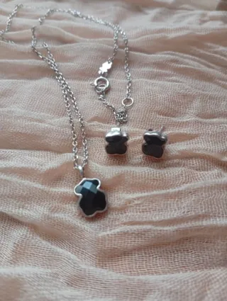 Conjunto de joyería de la marca Tous, compuesto por un colgante y unos pendientes. - Diseño de oso. - Colgante con piedra negra. - Cierre de mosquetón en la cadena.