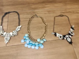 Conjunto de tres collares llamativos con detalles de pedrería y eslabones. - Diseño tipo gargantilla. - Adornos con piedras y cristales. - Cadenas de diferentes acabados.