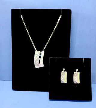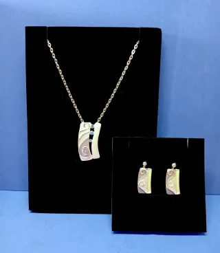 Elegante conjunto de collar y pendientes. - Diseño moderno con detalles curvos. - Acentos de pequeñas piedras azules. - Bisutería