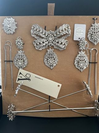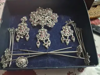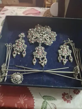 Conjunto de aderezo tradicional de fallera, con un diseño intrincado y detalles en piedras. - Broche central con colgante. - Pendientes a juego. - Horquillas. - Detalle de piedras rojas y plateadas.