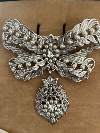 Elegante conjunto de joyería para fallera. - Diseño intrincado con detalles. - Incluye collar, pulsera y joya. - Adornos con pequeñas piedras brillantes.