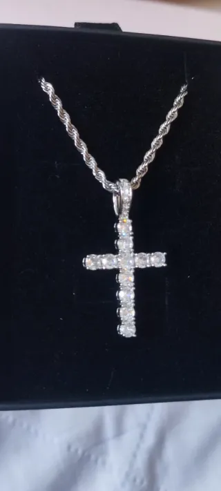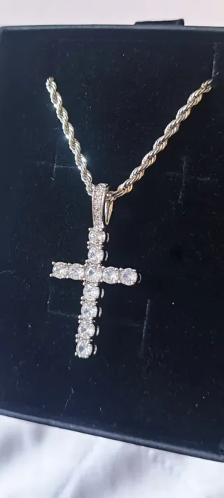 Elegante collar con colgante en forma de cruz adornado con circonitas. La cadena es fina y delicada. 💎 Collar con diseño de lujo - Material acero inoxidable de alta calidad y cristales de circonio Swarovski. -Piezas duraderas, que no se oxidan ni ennegrecen con el tiempo - Ideales para quienes buscan elegancia y distinción a un precio accesible. 🛑Se trata de joyas artesanales confeccionadas en joyería local, elaboradas con cristales Swarovski adquiridos a proveedor, pero no forman parte de la marca ni están asociadas a ella. 🎁 Perfectos para regalo o para dar un toque especial a cualquier look.