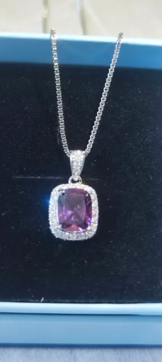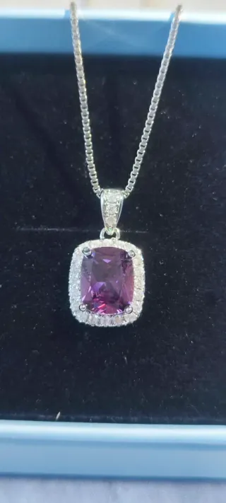 Elegante collar con colgante morado central rodeado de circonitas brillantes. 💎 Collar con diseño de lujo - Material acero inoxidable de alta calidad y cristales de circonio Swarovski. -Piezas duraderas, que no se oxidan ni ennegrecen con el tiempo - Ideales para quienes buscan elegancia y distinción a un precio accesible. 🛑Se trata de joyas artesanales confeccionadas en joyería local, elaboradas con cristales Swarovski adquiridos a proveedor, pero no forman parte de la marca ni están asociadas a ella. 🎁 Perfectos para regalo o para dar un toque especia
