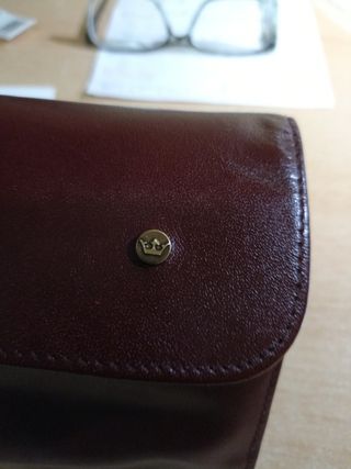 - marca de corona suelen representar lujo, calidad y distinción, hand made. -en piel en perfecto estado con tres bolsillos con cremalleras y zona para anillos que se abre.marca tiene una corona, no se que marca es
