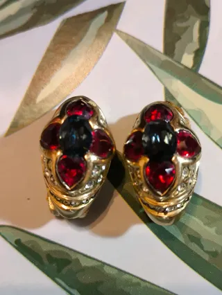 Elegantes pendientes de coctel con un diseño llamativo. - Base en tono dorado. - Detalle de piedras rojas en forma de corazón. - Adornos de pequeñas piedras transparentes. Se trata de unos pendientes de clip vintage con un diseño abovedado, adornados con grandes piedras de color rojo y una piedra central azul, rodeadas de pequeños cristales transparentes. El estilo es característico de las joyas de las décadas de 1950 a 1980, cuando los pendientes de clip eran muy populares. Tipo de cierre: Cierre de clip (también conocido como cierre de pellizco), común en bisutería y joyas antiguas.