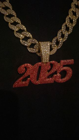 Elegante collar con colgante en forma del número 2025. Un accesorio llamativo. - Baño de oro laminado de 18 quilates. - Detalles en piedras rojas y blancas.