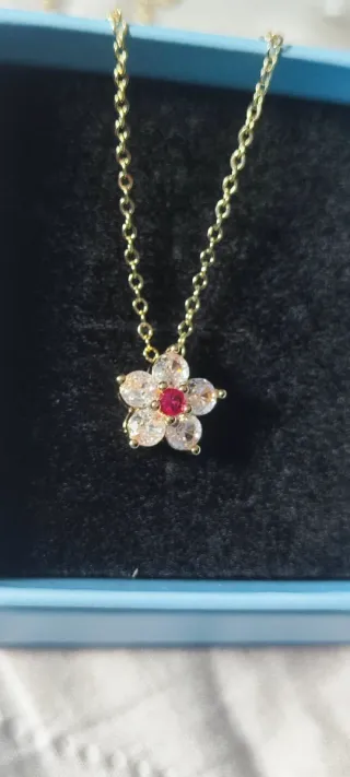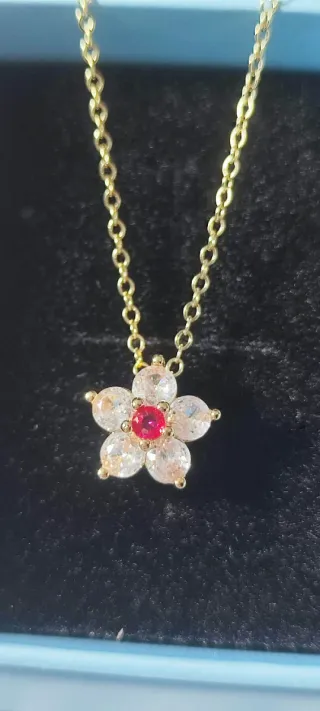 Elegante colgante con diseño de flor. - Detalles en circonitas blancas - Centro con gema roja. - Material acero inoxidable de alta calidad, baño oro y cristales de circonio Swarovski. -Piezas duraderas, que no se oxidan ni ennegrecen con el tiempo 🛑Se trata de joyas artesanales confeccionadas en joyería local, elaboradas con cristales Swarovski adquiridos a proveedor, pero no forman parte de la marca ni están asociadas a ella. 🎁 Perfectos para regalo o para dar un toque especial a cualquier look.