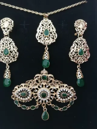 Conjunto de aderezo huertana con piedras verdes y detalles dorados. Nuevo - Diseño tradicional. - Piedras de color verde brillante. - Acabado en tono oro.