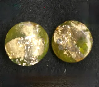 Conjunto artesanal hecho a mano, ideal para complementar tu estilo. - Pendientes redondos con detalles dorados. - Colgante ovalado con diseño único.