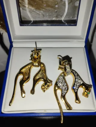 Elegante conjunto de pendientes y collar con diseño de pantera. - Pendientes con detalles en piedras brillantes. - Collar a juego con colgante de pantera. - Ojos de las panteras en color verde esmeralda.