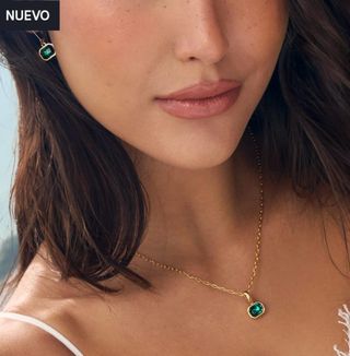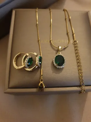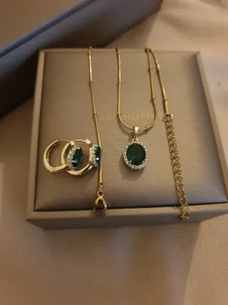 Elegante conjunto de joyería chapado en oro, presentado en su caja original. - Incluye collar con colgante y pendientes a juego. - Diseño con detalles en piedras verdes. - Cadena ajustable.