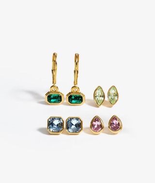 Set de cuatro pares de pendientes con gemas de colores. - Pendientes colgantes con gemas rectangulares verdes. - Pendientes de botón con gemas en forma de lágrima rosas. - Pendientes de botón con gemas en forma de ojo verdes pálidos. - Cierres dorados. Tres pares con tuerca y 1 con gancho. Chapados en oro de 24 quilates.