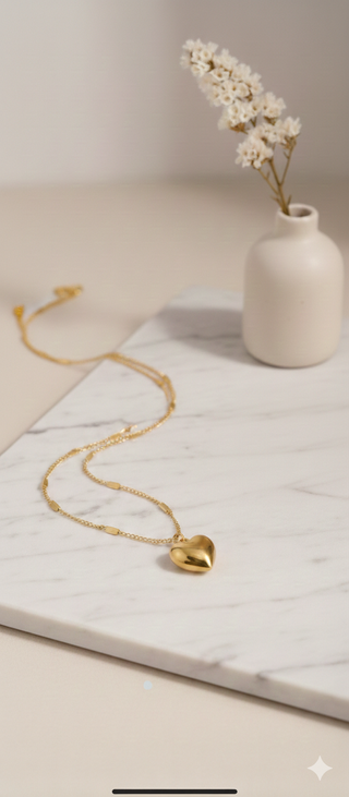 ¿Buscas un detalle especial o un básico que te dure siempre? ✨ Vendo este precioso collar con colgante de corazón "puffy" (hinchado) en color oro. Es una pieza minimalista y elegante, perfecta tanto para el día a día como para un regalo especial. Lo mejor de esta joya: Material: Fabricado en Acero Inoxidable (316L) de alta calidad. Olvídate de las manchas verdes en la piel; puedes usarlo en la ducha, piscina o playa sin que pierda su brillo. Diseño: Cadena de eslabones finos con detalles rectangulares que le dan un toque moderno y diferente a las cadenas comunes. Hipoalergénico: Ideal para pieles sensibles, no causa alergias.