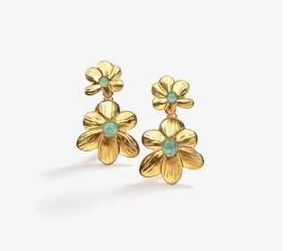 Elegantes pendientes con diseño de flor en tono dorado y un detalle central de piedra en color verde. Son un accesorio llamativo y sofisticado. - Diseño de doble flor. - Cierre seguro. Chapado en oro de 24 quilates, Tu joyería yanbal, se envían en su caja sellada.
